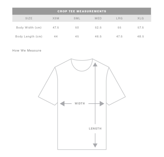Short body, dropped shoulders, neck ribbing, side seamed, shoulder to shoulder tape, double needle hems, preshrunk to minimise shrinkage